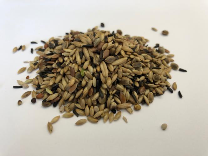 Kanariensaat 41%, Rübsaat 30%, Leinsamen 8%, Nigersamen 7%, Haferkerne 6%, Hanfsamen 4%, Perillasamen 2%, Wildsamen 2%